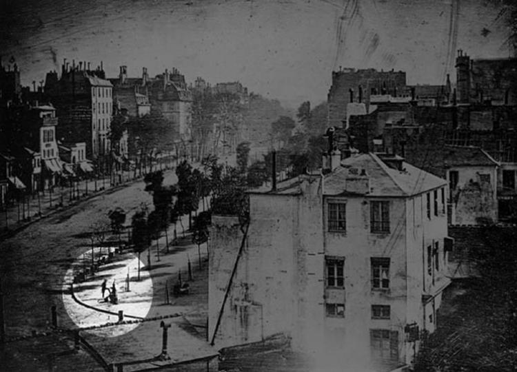 The first human to be photographed, albeit unintentionally, was captured in the background of a photo taken by Louis Daguerre in 1838. The image shows a man getting his shoes shined on a busy street in Paris. Although his identity remains unknown, this fleeting figure forever became a part of photographic history as the earliest captured human presence.